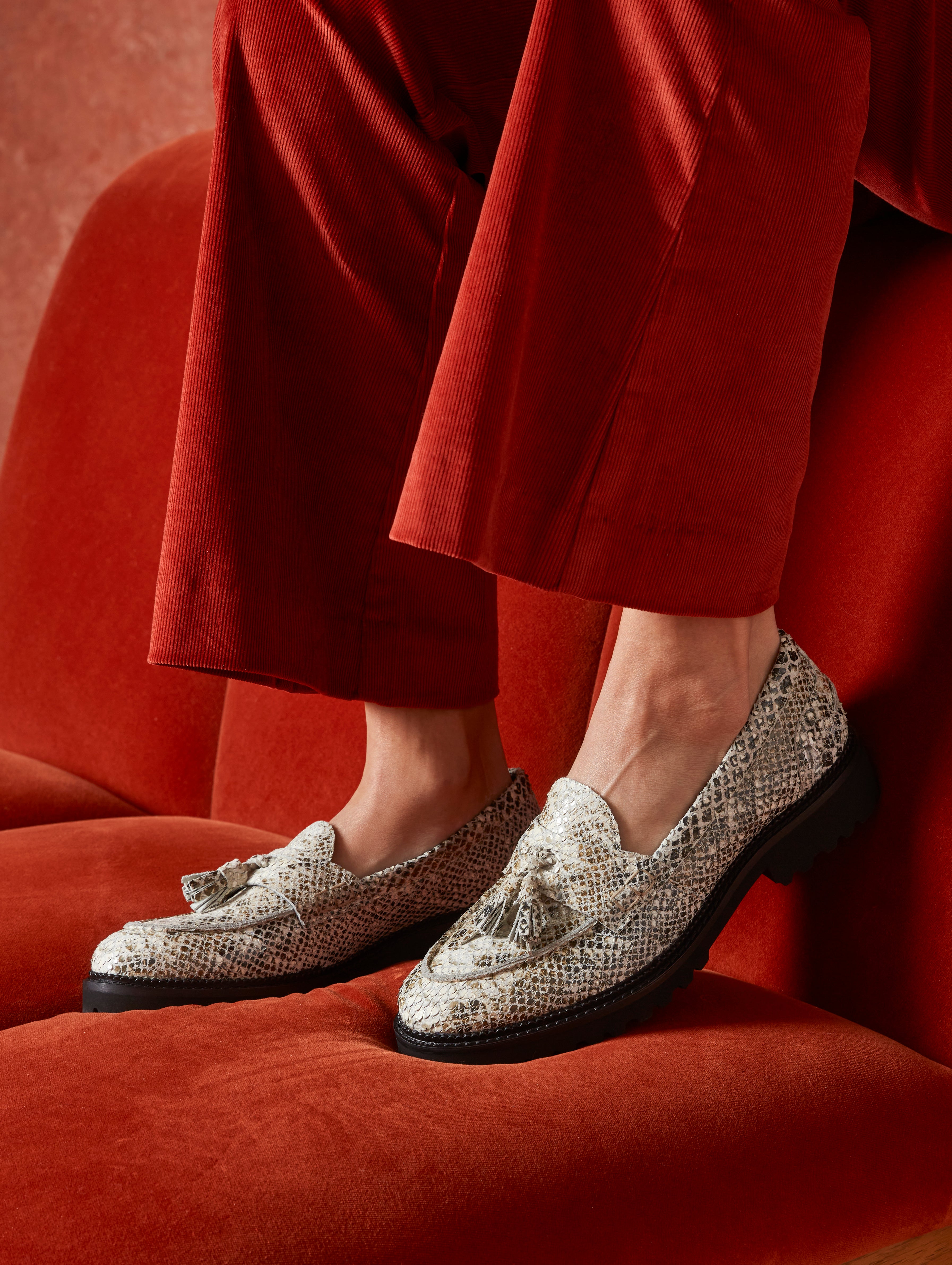 Ginny’s got that texture you can’t ignore. With a bold snake-effect finish, she gives classic loafer style a confidence boost. Think of her as a fresh alternative to suede loafers, perfect with neutrals or mixed with bold prints when you want to switch things up.